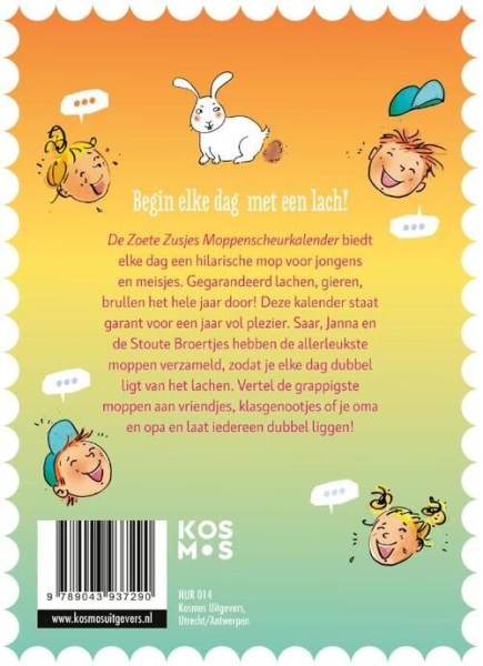 Lach je elke dag een breuk met De Zoete Zusjes Moppenscheurkalender! Deze vrolijke scheurkalender zit boordevol grappige moppen die perfect zijn voor kinderen vanaf 6 jaar. Elke dag ontdek je een nieuwe mop die je aan het lachen maakt en je dag opvrolijkt. Het is een geweldige manier om samen met je gezin plezier te hebben en het ideale cadeau voor jonge grappenmakers!