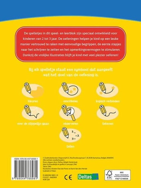 Het Leerrijk Spelletjesblok voor kinderen van 2 tot 3 jaar biedt een wereld vol plezier en educatie. Dit speel- en leerblok is speciaal ontworpen om jonge kinderen op een speelse manier bekend te maken met eenvoudige begrippen. De oefeningen in het blok bieden de perfecte voorbereiding op het leren schrijven en stimuleren daarnaast het opmerkingsvermogen van je kleintje. Met kleurrijke illustraties en boeiende activiteiten blijft je kind enthousiast en gemotiveerd om te blijven oefenen en ontdekken!